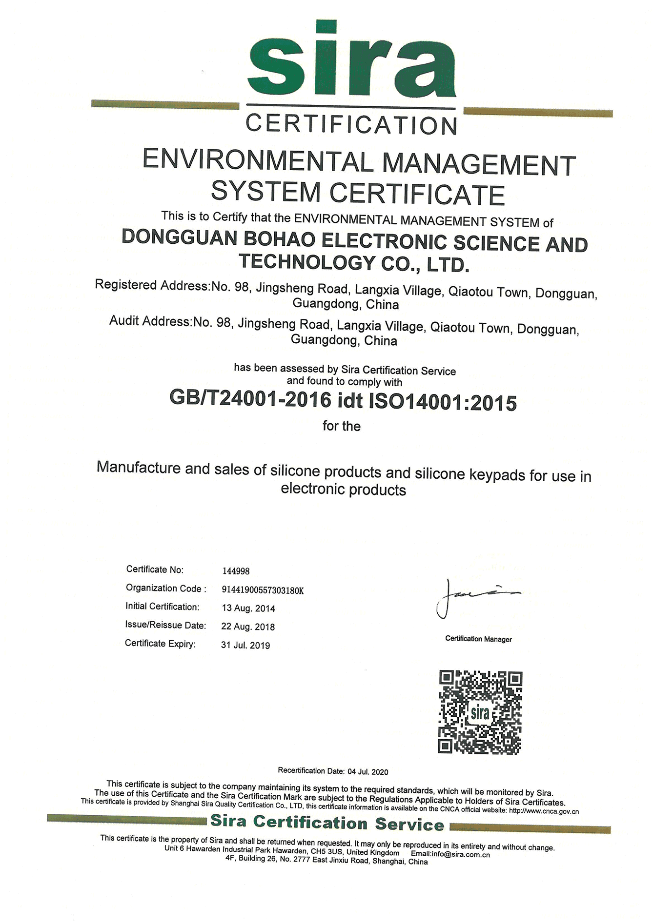 ISO14001:2015環境管理體系認證英文證書
