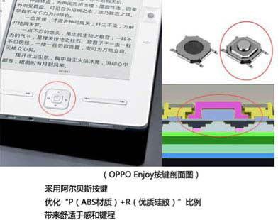 翻頁(yè)鍵要考慮拇指指腹大小以及表面弧度。OPPOEnjoy的翻頁(yè)鍵是一個(gè)類似波浪的設(shè)計(jì),保證指腹是在一個(gè)曲率半徑較大的弧線上進(jìn)行操作,非常接近自然狀態(tài)。這樣的設(shè)計(jì)的好處,可以在不增加鍵帽的視覺高度基礎(chǔ)上,增加鍵程,緩解按鍵過多的疲憊感,關(guān)于鍵程增加帶來的益處在手感篇詳談。