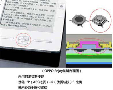 目前按鍵基本采用的都是ABS材質(zhì)類似電腦鍵盤,有過去網(wǎng)吧經(jīng)驗(yàn)的人就知道,通過看鍵盤上字跡的磨損程度和磨損的鍵位就知道近是流行CS還是勁舞團(tuán),字跡的耐磨度是一個(gè)不小的考驗(yàn)。目前一般是采用激光鐳雕或者絲印,但是電子書產(chǎn)品一般是白色的面殼,如果采用激光鐳雕會(huì)留下比較明顯的痕跡,但如果直接把絲印暴露在外面,長(zhǎng)期摩擦字跡就會(huì)消失,為了解決這個(gè)矛盾,Enjoy創(chuàng)新采用一種夾層工藝,ABS表面首先噴涂底層(主要是著色),然后絲印,后在絲印上再采用噴油工藝,這樣就保證了絲印的耐磨度同時(shí)也隔絕了手上汗?jié)n對(duì)絲印的侵蝕。