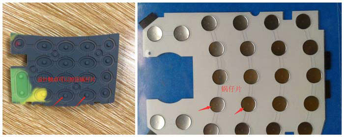 對于用鍋仔片的硅膠按鍵需要在按鈕下面設計相應的觸點結構。