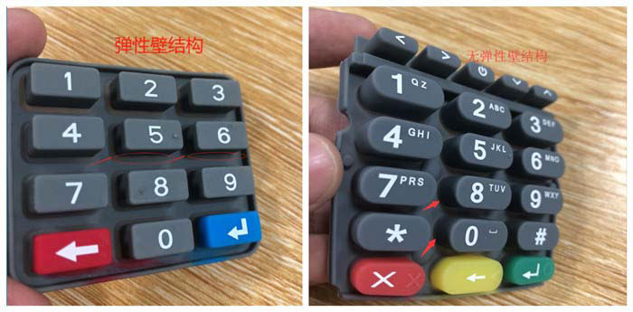 大多數硅膠按鍵都是選擇用碳粒或是導電油墨來實現導電功能,而直接通過按鍵來導電則要求按鍵具有按下去彈回來的彈性壁結構。(鍋仔片和輕觸開關他們自帶回彈功能,所以對應的硅膠按鍵一般不需要再設計彈性壁結構)