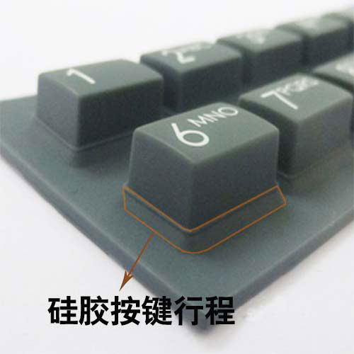 行程是指硅膠按鍵的導電面到PCB之間的距離,這個要靠硅膠按鍵與塑膠外殼的設計來配合,一般我們做遙控器按鍵的行程通常都做到1.1±0.1mm,這個行程能夠滿足大眾的手感要求,按鍵在按下的過程中有明顯的段落感,手感舒適,這種行程的按鍵高度一般要高出機殼1.7mm左右,即按鍵按下后表面還高出機殼0.5mm左右,這樣就能避免硅膠按鍵卡鍵或者彈不起來的問題。