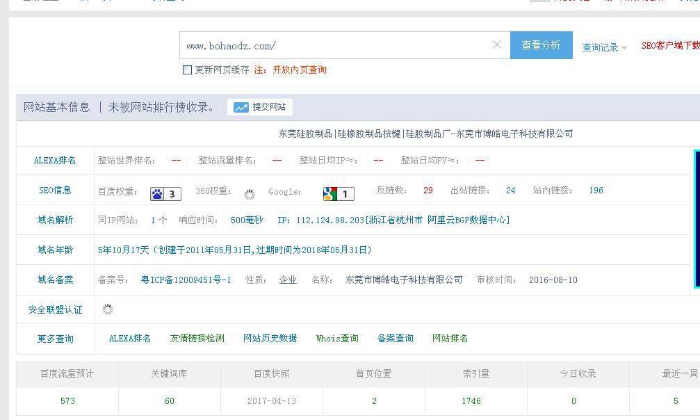 今天早上小編查詢博皓電子官網的站長的SEO數據,發現一個不小的驚喜,那就是博皓電子(m.sawwire.cn)官網百度權重到3了。之前小編一直在心中提問,硅膠制品行業的官網可以優化到3不?當時心中是認為不太可能的,今天也終于實現了。