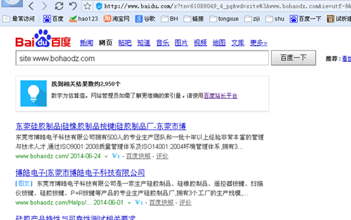 2、用百度搜索這家硅膠制品廠在百度上的收錄情況,如site:m.sawwire.cn 這樣你查到就是東莞市博皓電子科技有限公司在百度的收錄情況,360、搜搜等搜索引擎也是一樣的方法。