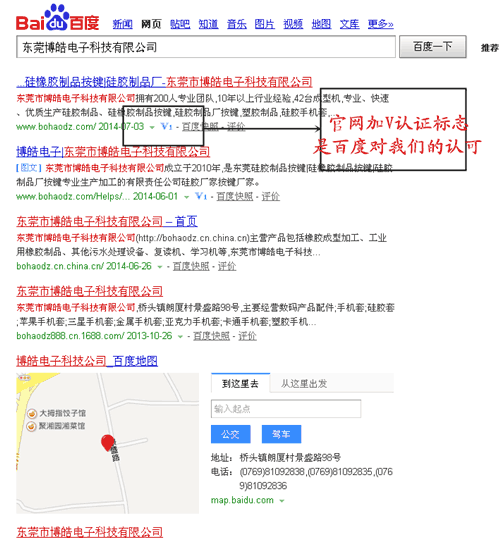 1、找到他們的官方網站,如:東莞市博皓電子科技有限公司的官方網站網址就是http://m.sawwire.cn,網址后面后又一個大V,這個是百度對這家公司網站的一個認證標志。