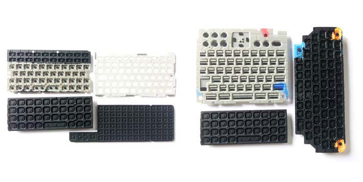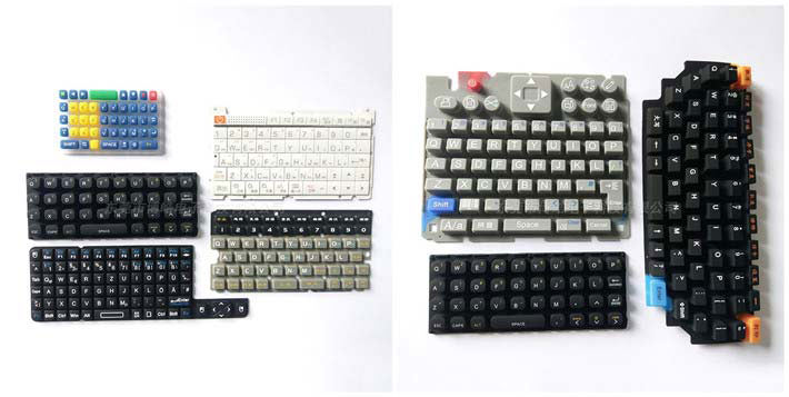 從上圖可以看到迷你鍵盤的長度可以從幾厘米到幾十厘米不等,可以是純硅膠按鍵也可以是P+R的,鍵盤上的key可以做成不同顏色,按鍵字符既有絲印也有鐳雕樣式的。它們用于學習機、標簽打印機、工業儀表等產品上,不但外觀精美手感柔和,并且非常耐用,可以達到20萬次以上的使用壽命。迷你硅膠鍵盤的背面導電有采用導電油墨、導電黑粒和鍋仔片。