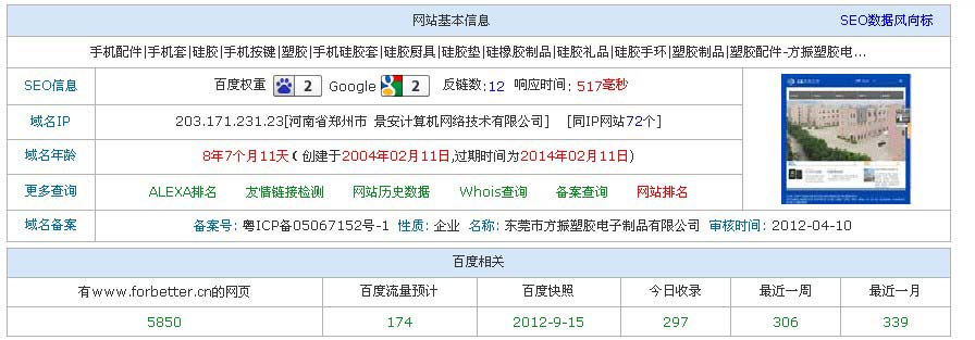 東莞博皓電子是今年上線的,正式的優化花費了大概有3個月時間,計劃中的幾個有目標關鍵詞現在都排名第一了,接下來的三個月是將熱門關鍵詞硅膠、硅橡膠、按鍵優化到百度首頁的前5名,外鏈做的比較好,網站的設計在整個硅膠行業的企業網站里面應該可以說是好的,缺點是上線不久,還處于百度的沙盒效應中,導致收錄數量很差,后期可能會有排名不穩定的現象。
