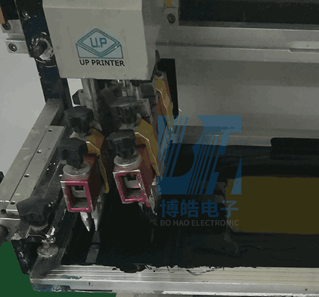 下面來到絲印部門,圖中是絲印黑色油墨,網版上是黑色的油墨,只需按一下開關,機器就會從左刷到右,硅膠按鍵完成一次字符印刷