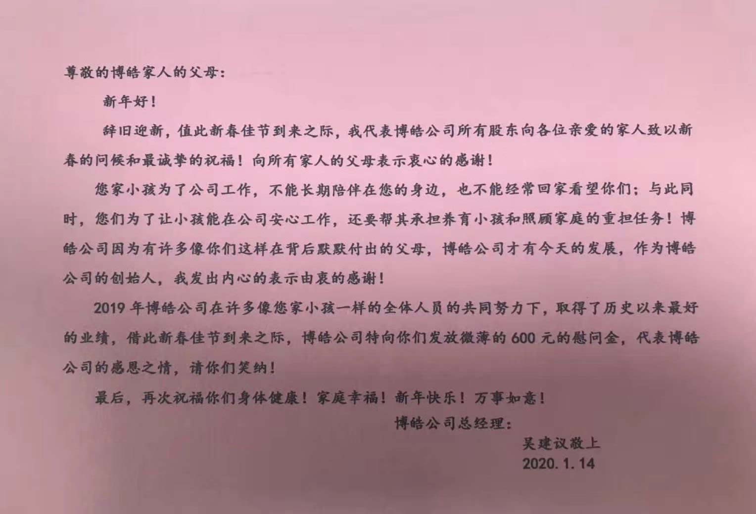 不少員工替父母拿到這筆慰問金后,在朋友圈發了圈,配文言辭雖是簡單,但字里行間都充滿了感恩,原諒我們不善言辭,滿腔熱愛無法言出,卻心懷感恩,愛公司極深。博皓總經理吳總更是在不少員工朋友圈下評論“2020年繼續努力,爭取翻倍!”,
