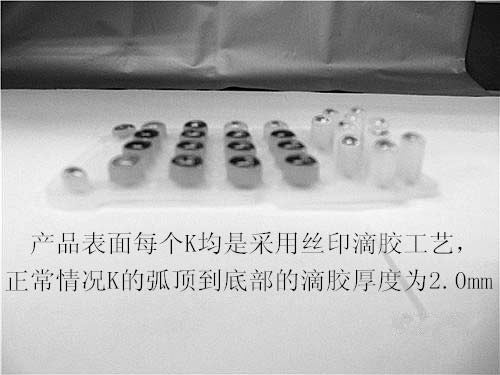 這款產(chǎn)品是一款用在醫(yī)療器材上面的按鈕,因此客戶要求表面的字符必須清晰而且長久耐用,所有客戶會選擇表面滴膠工藝,如圖: