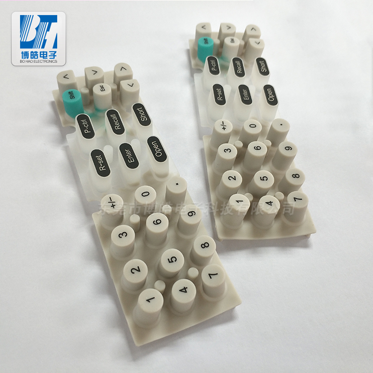 - 微機綜保按鍵,硅膠材質,采用多色成型和絲印工藝,該按鍵經過荷重耐摩擦的測試,在博皓電子共有32臺油壓成型機可以保障大批量訂單交期穩定。